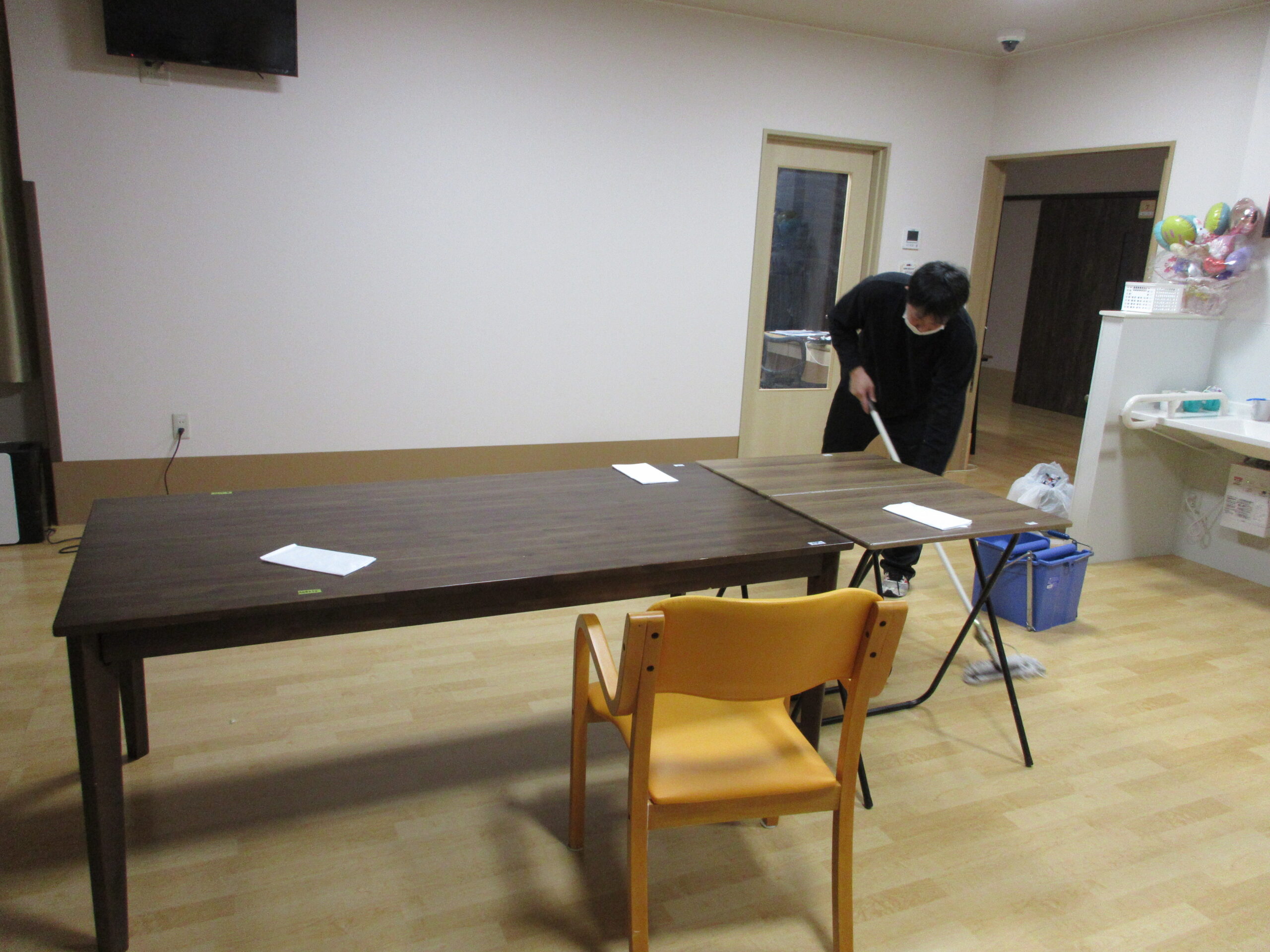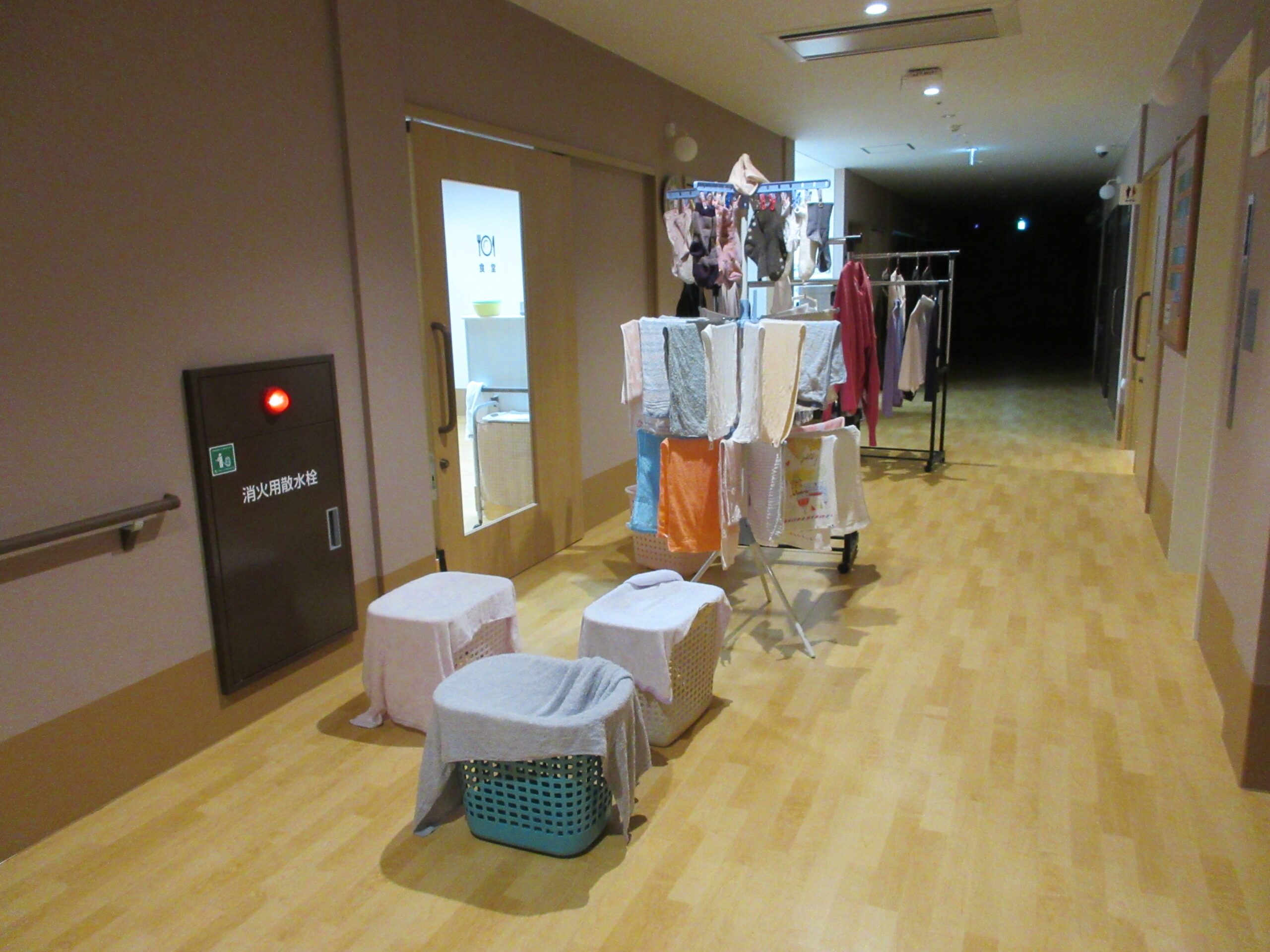 あじさいでは、入居者様の洗濯を職員が行っています。全事業所、天気がいい日は外に出し、夜間には加湿も兼ねて室内で干してあります。食堂の掃除や消毒を行い、朝食時のエプロンの用意をしています。これは毎日、毎晩行われています。